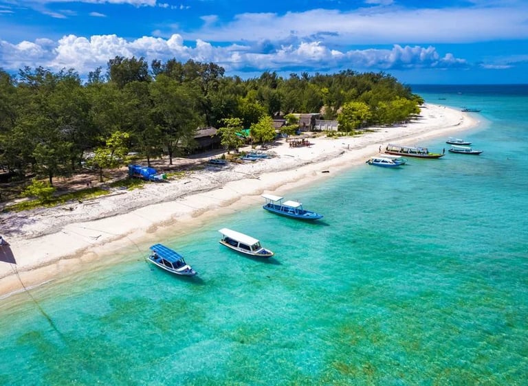 Gili Trawangan is the largest of the Gili Islands, located off the northwest coast of Lombok, Indonesia. Known for its crystal-clear waters, vibrant coral reefs, and lively atmosphere, it is a popular destination for snorkeling, diving, and beachside relaxation. The island is also famous for its nightlife, beachfront cafés, and its car-free environment, where transportation is limited to bicycles and horse-drawn carts, creating a laid-back tropical escape.